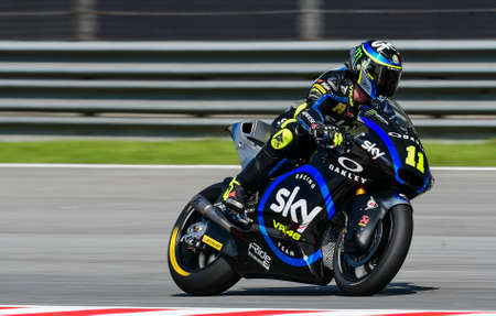 SEPANG, MALAYSIA - NOVEMBER 03, 2019 : Nicolo Bulega (11) of Italy and Sky Racing Team VR46 Kalex during the Moto2 Malaysia Motorcycle Grand Prix (MotoGP) at Sepang International Circuit (SIC).