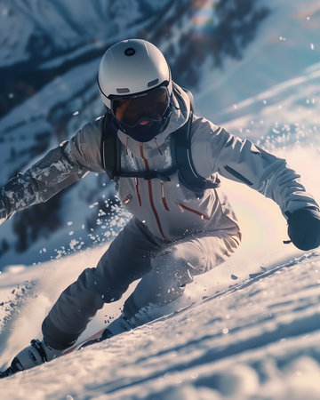 skier white jacket helmet skiing down snowy slope lens flares padded shoulders, generative ai