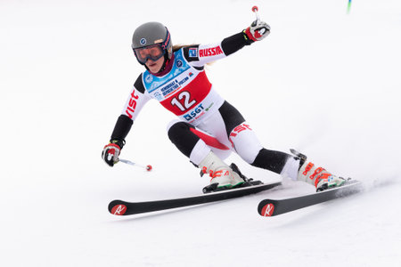 KAMCHATKA PENINSULA, RUSSIA - APR 2, 2019: Mountain skier Alopina Kseniya Chelyabinsk skiing down mount. Russian Women s Alpine Skiing Cup, International Ski Federation Championship giant slalom