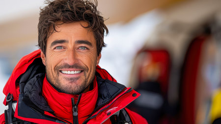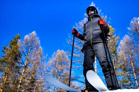 Man in warm jacket and hat against ski resort background with copyspace. High quality photo