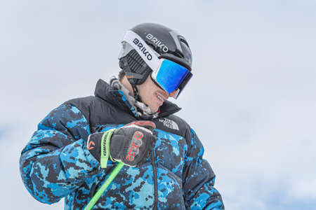 El Tarter, Andorra: 2021 February 08: Free style skier at the Grandvalira resort in winter 2021