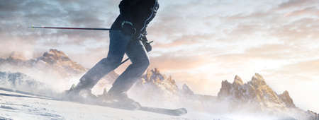 Flying skier on mountains. Extreme winter sport. 3d rendering