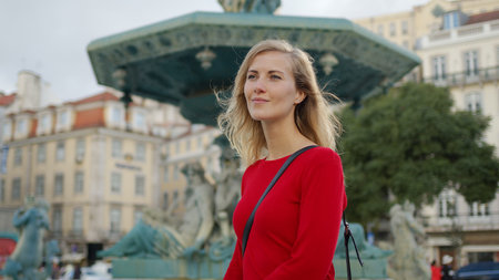 Young attractive woman relaxes at a fountain in the city of Lisbon - CITY OF LISBON, PORTUGAL - OCTOBER 15, 2019