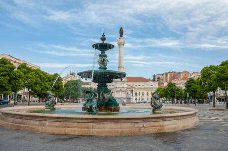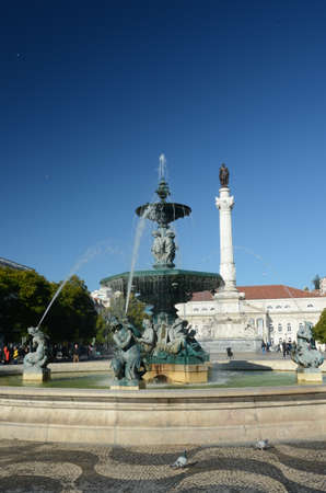 Lisbon, Portugal - September 11, 2011: South Fountain and Column of Pedro IV on the background, Rossio Square