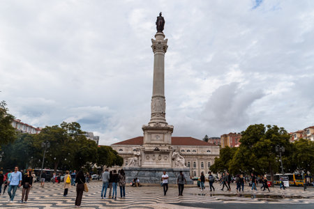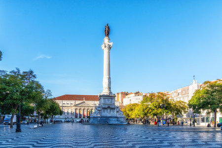 Lisbon, Portugal - October 29, 2022: A wide shot of Praca Dom Pedro IV, a popular square in Lisbon, Portugal, featuring the iconic column and bustling crowds.