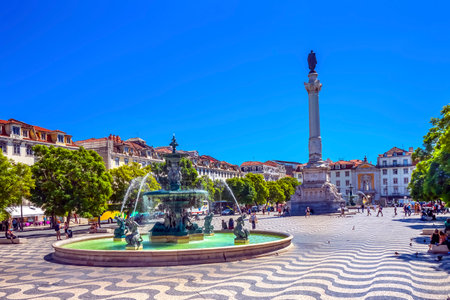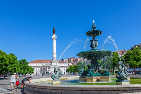 Rosio Square Fountain (Pedro IV Square) in Lisbon, Portugal. Summer sunny day.