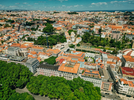 View of the central part of the Lisbon from Santa Justa Lift, Portugal. Aerial view.