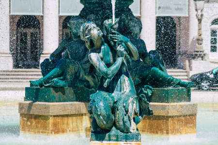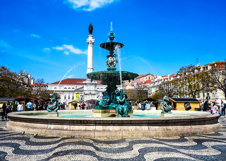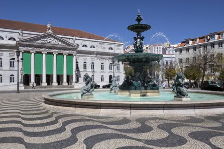 City of Lisbon - Portugal. Fountain near the Teatro National Theater in Rossio Square (official name - Praca de D. Pedro IV).