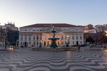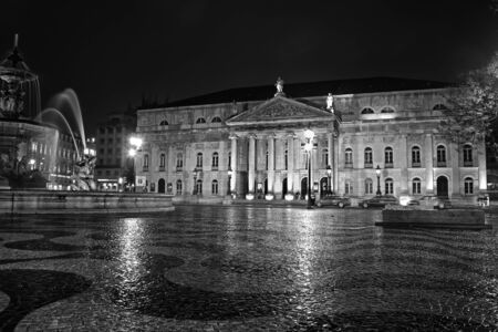 Lisbon downtown, Portugal, Europe, Baixa District. Urban scene by night. Baroque fountain on popular Praca Dom Pedro IV or Rossio Square. The National Theater D. Maria on background.