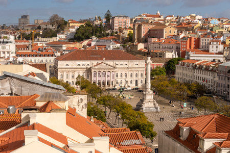 Lisbon, Portugal - February 01, 2024: View over town square Praca Dom Pedro IV and Teatro Nacional Dona Maria II in downtown Lisbon, Portugal
