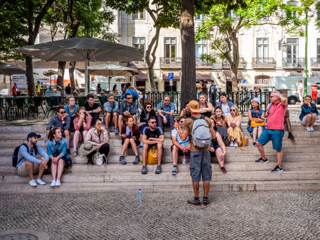 Lisbon, Portugal - April 11, 2019: Lisbon Portugal city skyline at Lisbon Rossio Square with many tourist