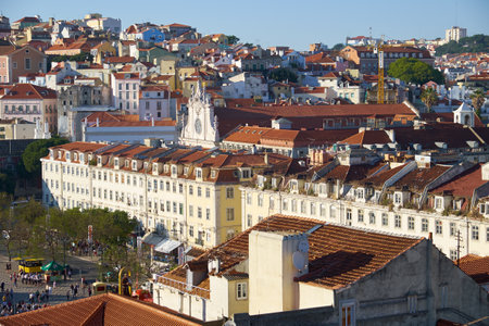 LISBON, PORTUGAL - JUNE 25, 2016: Residential houses near Rossio Square (Pedro IV Square) in the Pombaline Lower Town (Baixa) as seen from observation platform of Santa Justa Lift. Lisbon. Portugal