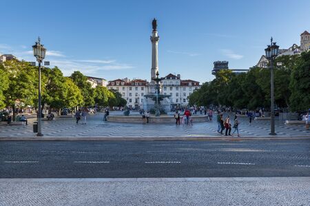 LISBON, PORTUGAL - OCTOBER 30, 2018: Restauradores Square with tourists on a beautiful day.