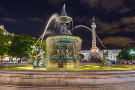 Lisbon downtown by night. Spectacular baroque fountain and statue of Dom Pedro IV in Praca Dom Pedro IV or Rossio Square in Lisbon, Portugal, Europe. Urban scene.