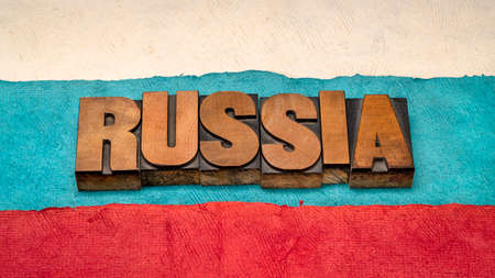Russia word abstract in vintage letterpress wood type against paper abstract in colors of RUssian national flag