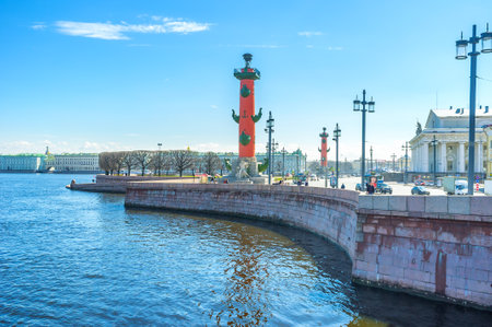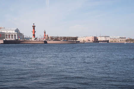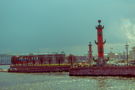 SAINT PETERSBURG, RUSSIA - APRIL 27, 2015: The Spit of Vasiilevsky Island is one of the most notable landmarks with two rostral columns and beautiful Stock Exchange building between, on April 27 in S. Petersburg