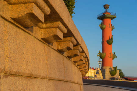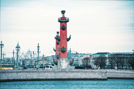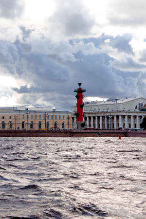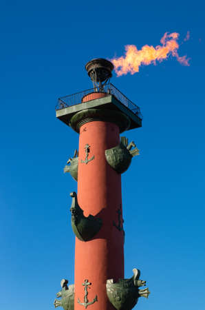 Rostral column on the Spit of Vasilievsky Island in the center of St. Petersburg, Russia