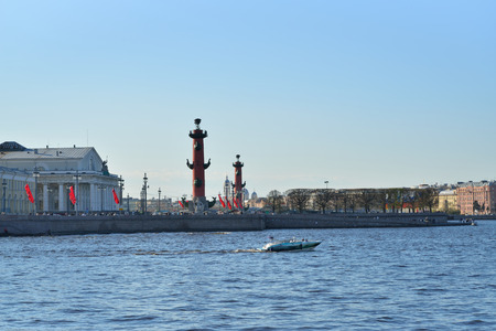 Pleasure boat floats on the Neva river on the background of the Rostral columns in Saint-Petersburg in May