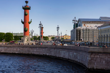 Rostral columns in Saint Petersburg. Architecture of Russia. City landscape in Saint Petersburg. Russian city on summer day. Exchange bridge over Neva. Guide to cities of Russia. Panorama Petersburg