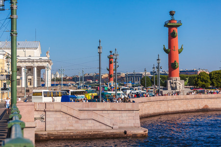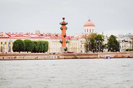 RUSSIA, SAINT PETERSBURG - AUGUST 18, 2017: Landmarks of Vasilievsky island spit - rostral column and old stock exchange building. Urban landscape of St Petersburg, Russia