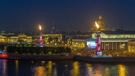 Timelapse over the city of St. Petersburg (Russia) on the feast of Scarlet Sails , view from roof. View of the Exchange Bridge, rastralnye column, St. Isaac's Cathedral