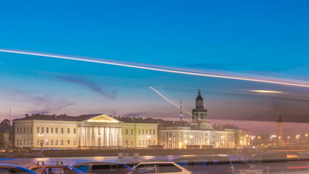 Building of Kunstkamera and the cityscape night timelapse viewed from the Admirality embankment with traffic. Built in 1727, the Kunstkamera is the first Russian museum