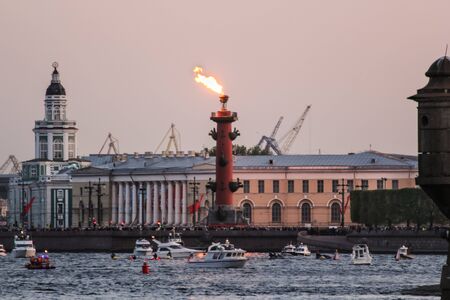 Torch on Rasstralnoy column. Travel types of summer Saint-Petersburg along the Neva River.