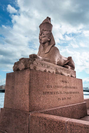 ST. PETERSBURG, RUSSIA - MAY 29, 2017: Sphinxes at the Universitetskaya Embankment, in front of the Imperial Academy of Arts. They were brought from Egypt to Russia at the height of Egyptomania in 1832.