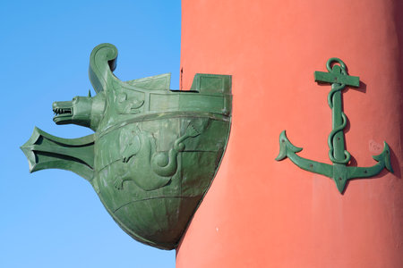 Fragment of the ancient southern Rostral Column (1810) close-up. Historical center of St. Petersburg. Russia