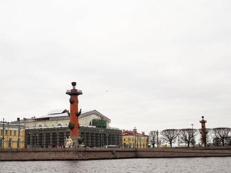 Saint Petersburg, Russia - November 06, 2019: Rostral Columns on the spit of Vasilievsky island. Saint Petersburg. Russia.