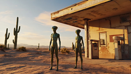 Extraterrestrial figures aliens standing full-length by old gas station in American Texas desert landscape on sunny day