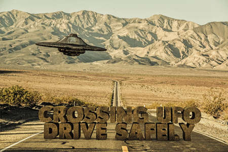 An unidentified flying object hovers over a mountainous desert landscape at dusk, sparking theories of extraterrestrial visitation and mystery.