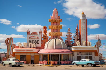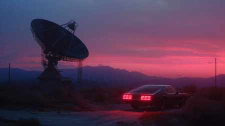 An illuminated vintage neon sign dominates the twilight sky. The sign features vibrant colors and a rocket ship, promoting a diner. The composition includes a car's headlights and tail lights on a road. This image could be used for advertising, editorial content, or creative projects related to nostalgia or dining.