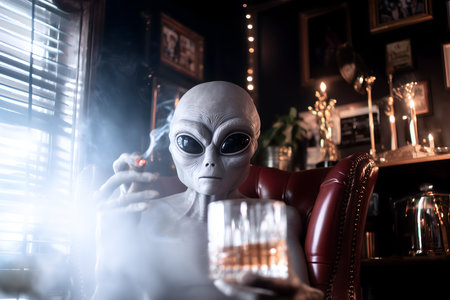 A humanoid alien lounges in a red armchair, smoking a cigar and sipping whiskey. Cozy, mysterious, and surreal atmosphere.