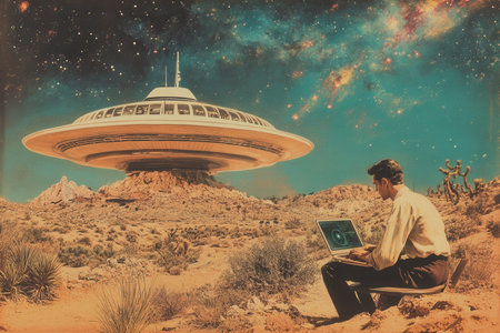 Extraterrestrial encounter a man works on a laptop under a ufo in the desert