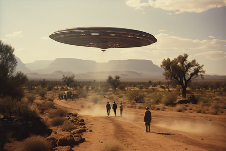 Unexplained encounter with otherworldly alien figures in the eerie and spooky wilderness desert landscape