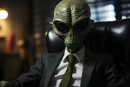 Alien businessman in a suit sitting in his office and looking at camera. Green humanoid wearing glasses indoors.