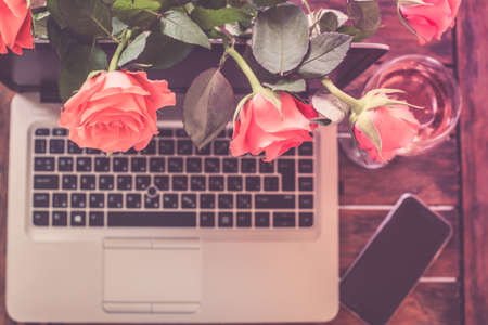 Top view, home office work space. Workplace with laptop, roses, phone on wooden background.