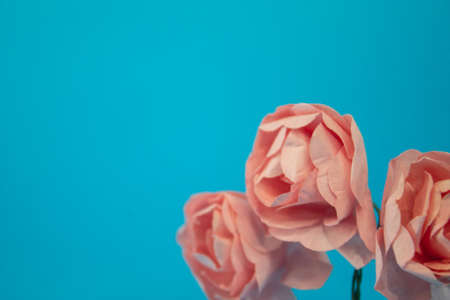 Beautiful pink roses on blue sky background. Shallow depth of field