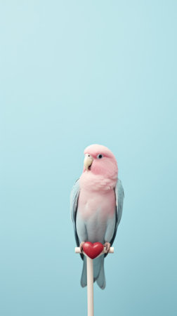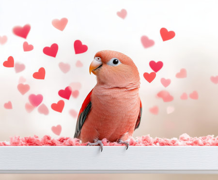 Adorable pink lovebird surrounded by red hearts on soft blanket.