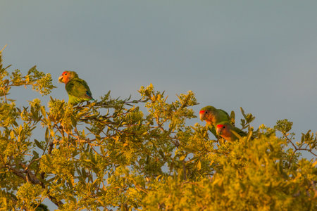 The rosy-faced lovebird. Species of lovebird native to arid regions in southwestern Africa such as the Namib Desert. Mowani, Damaraland, Namibia, South Africa.