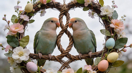 two beautiful green parrots lovebirds agapornis in gold cage having eggs