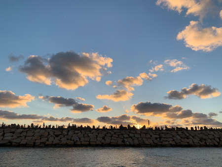 Breakwater on a background of sunset sky with clouds