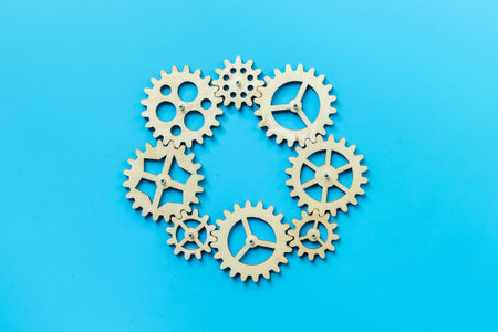 Wooden gear on a blue background. Abstract background for presentations and banners. The concept of technology and industry, the think process. Part of a large complex mechanism. Banner