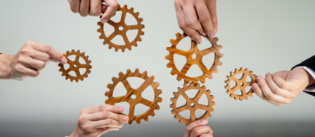 Interlocking gears in gold and silver colors are creating a complex clockwork system, symbolizing precision, teamwork, and industrial innovation working together for business and technology