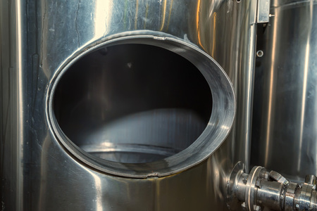 Stainless steel brewing tanks and equipment, iron reservoirs and pipes in modern beer factory. Brewery