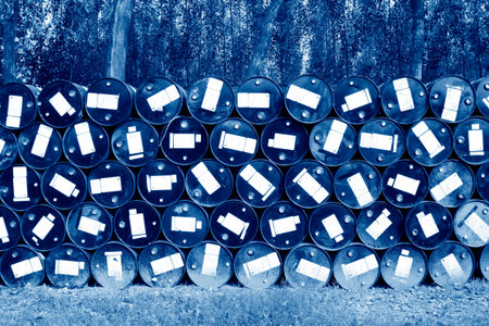 old oil barrels or chemical drums stacked up, industry oil barrel