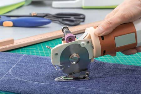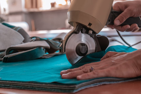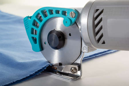 Hand-held circular electric textile saws with thin sharp cutting discs are used for cutting fabrics, close-up.