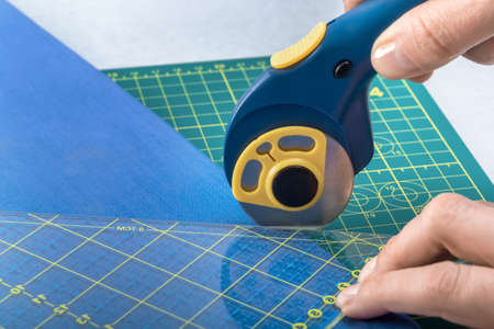 Close-up female hands cutting fabric with patchwork rotating cutter