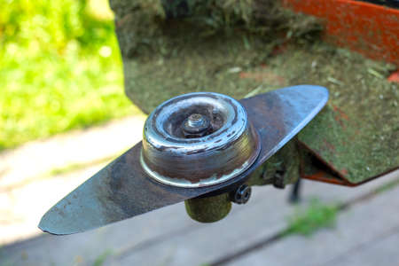 Close-up of the head of a gasoline lawn mower with a blade for cutting tall grass. garden equipment